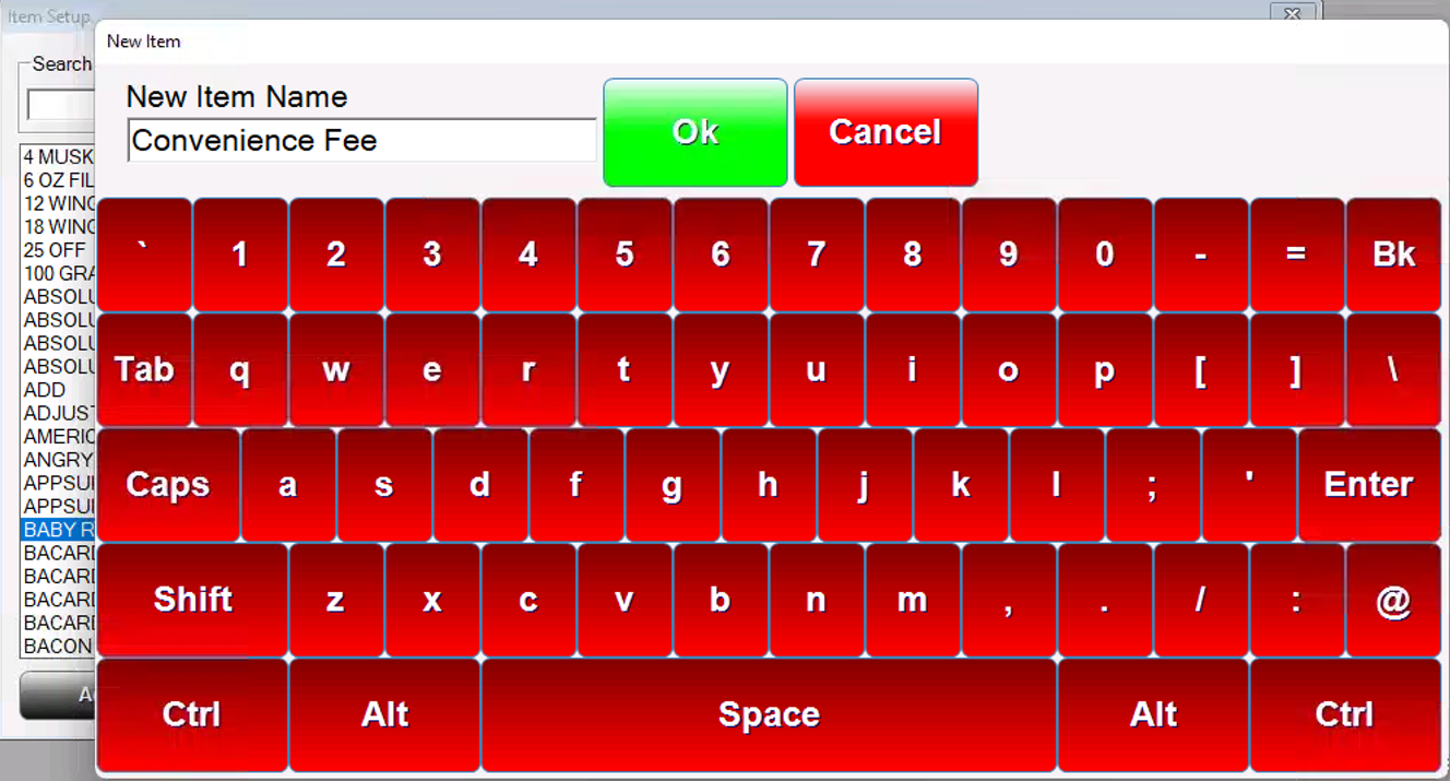 3. Type in Convenience Fee (or whatever you would like this fee to be named) for the New Item Name. Click OK to confirm.